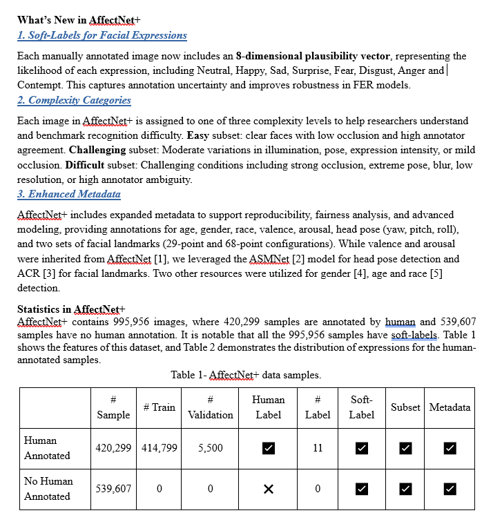 Clarification: The AffectNet+ database is released for academic research purposes only. All papers or publicly available text that use the compound or partial images of the database must cite the paper listed above.