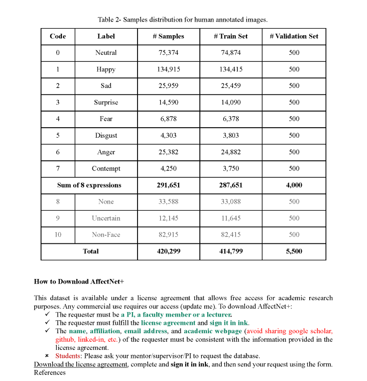 For downloading AffectNet+, Only PIs, Lab Managers or Professors can request AffectNet+ by downloading and completing and signing the LICENSE AGREEMENT FILE. Once the agreement is completed, use the following form to submit your request. Make sure you attach the agreement file to the form.